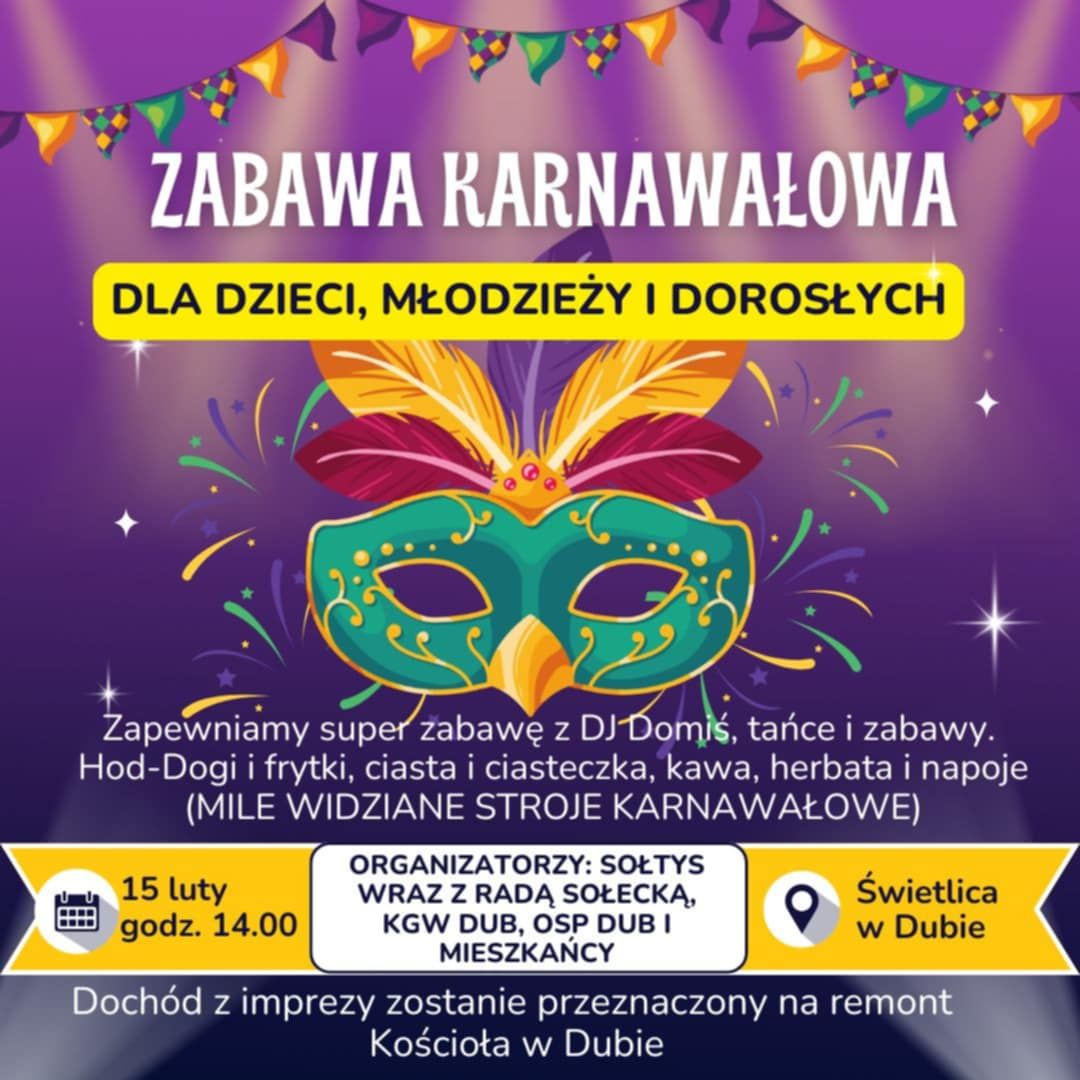 W przyszłą niedzielę 15 lutego KGW i Pani Sołtys z Duba serdecznie zapraszają do dubieńskiej świetlicy na Zabawę Karnawałową. Organizatorzy zapewniają przednią zabawę. W przygotowaniu są ciasta, napoje i dubieńskie hot-dogi. Zapraszamy wszystkich całymi rodzinami. Będzie można się świetnie pobawić a przy okazji wesprzeć remont kościoła parafialnego, gdyż dochód przeznaczony jest na ten cel.. Rozpoczęcie o godz. 14.00. Organizatorzy serdecznie zapraszają. Szczegóły na plakacie informacyjnym i stronach internetowych. Niech wszyscy poczują się zaproszeni.