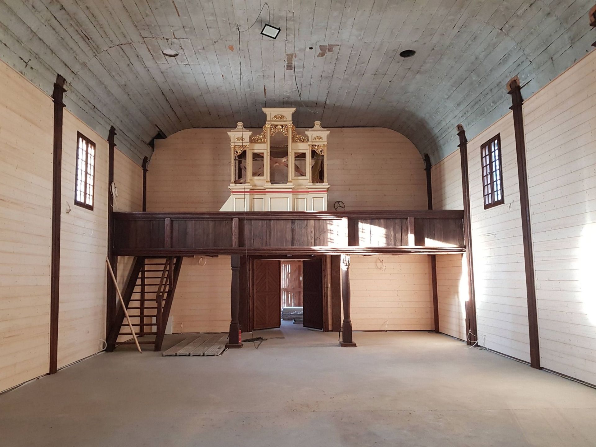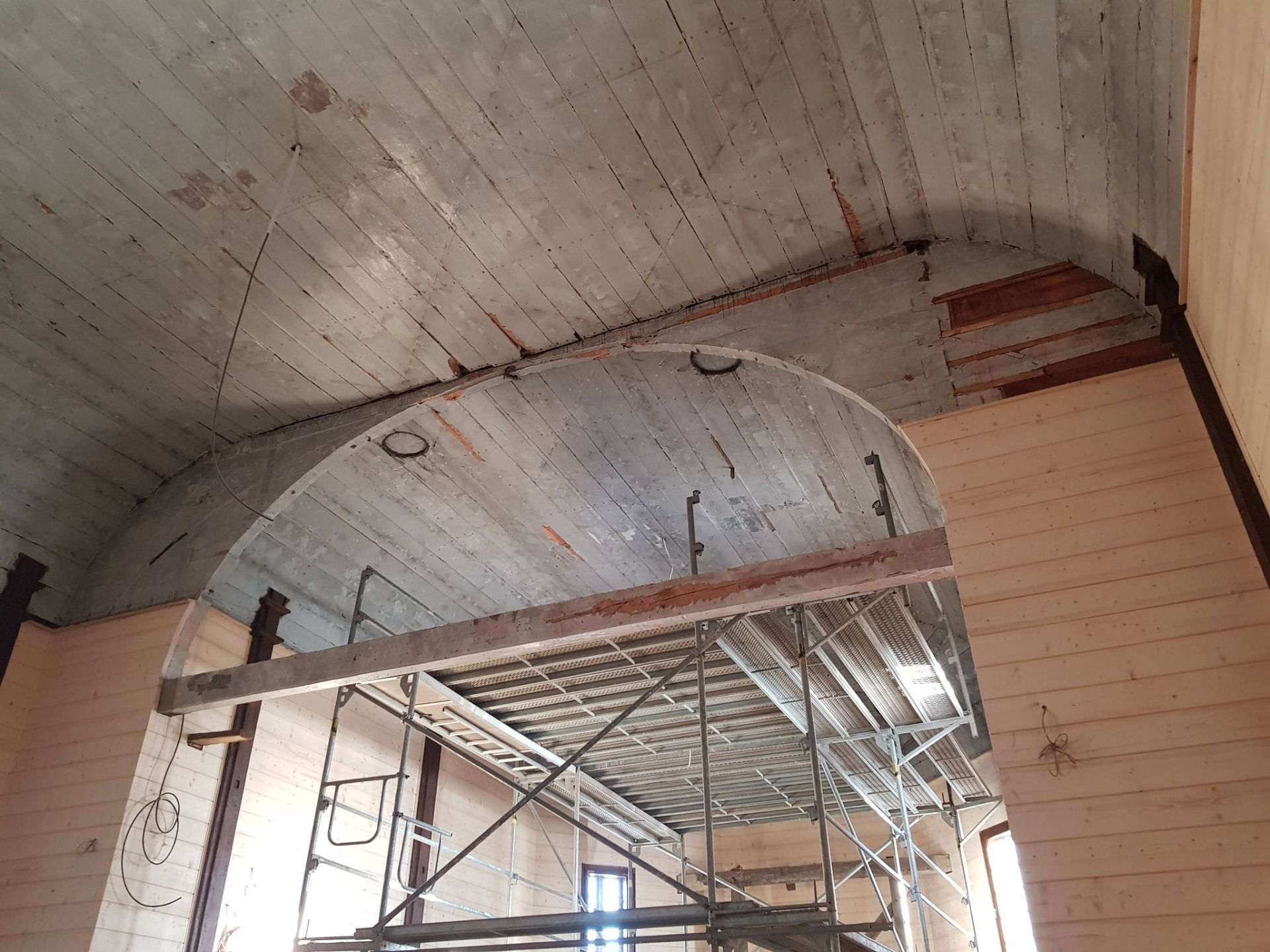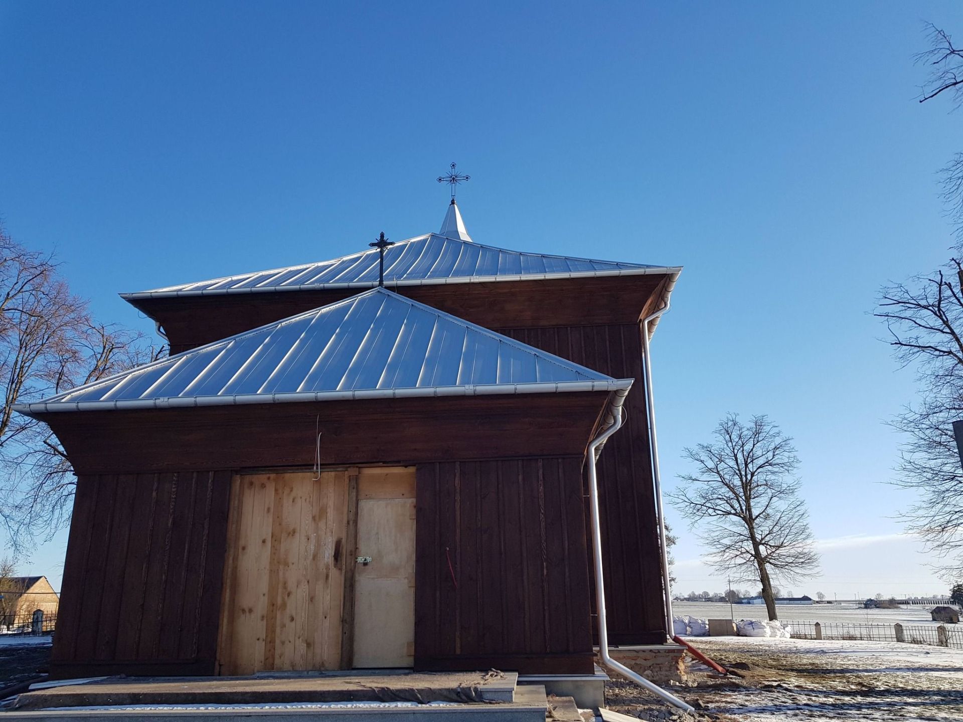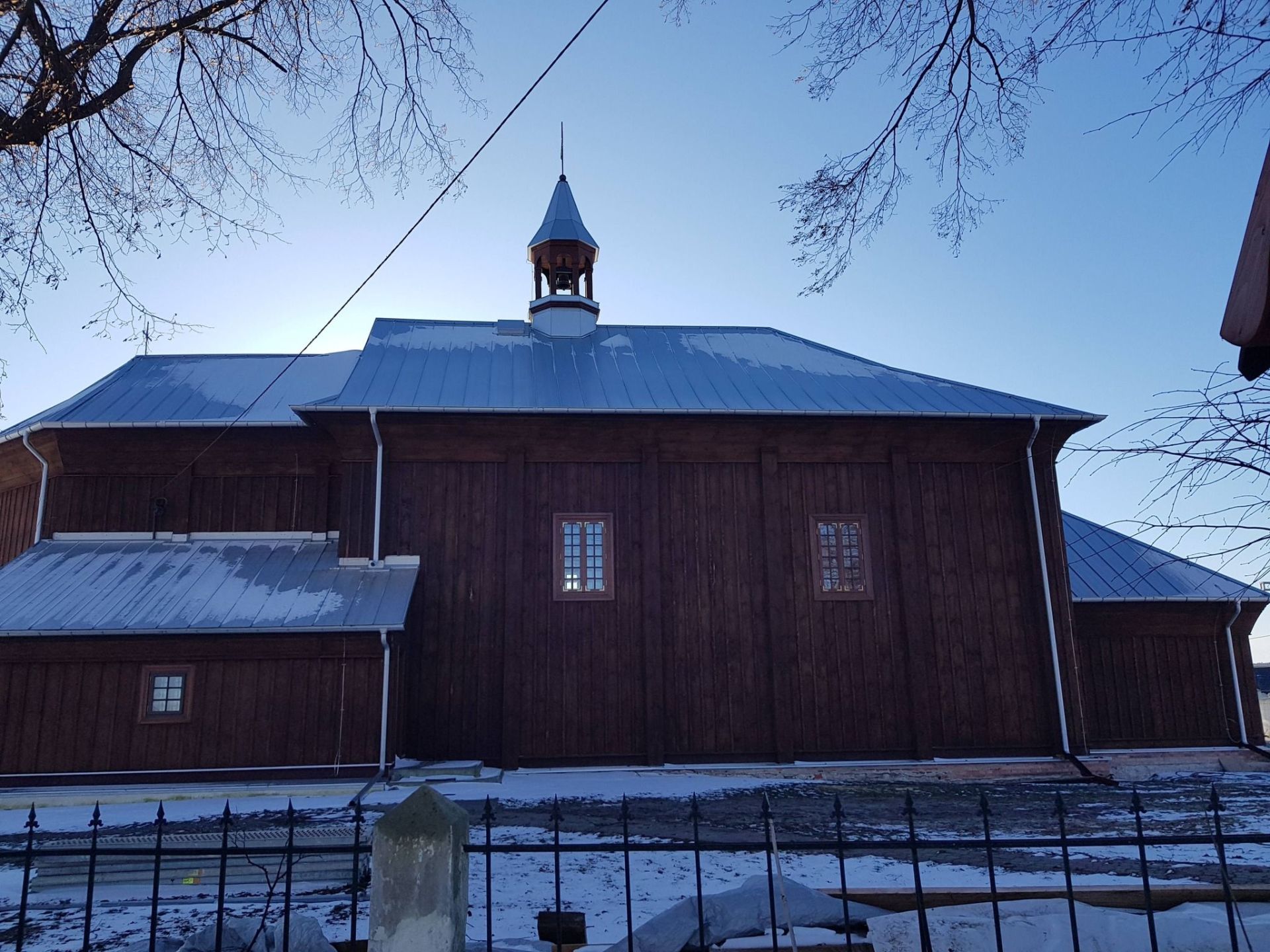 Zakończony został pierwszy etap prac przy remoncie kościoła. Wzmocniono konstrukcję budynku poprzez wymianę uszkodzonych elementów, wykonano dach, połozono szalunki zewnętrzne i wewnętrzne, wykonano chór.