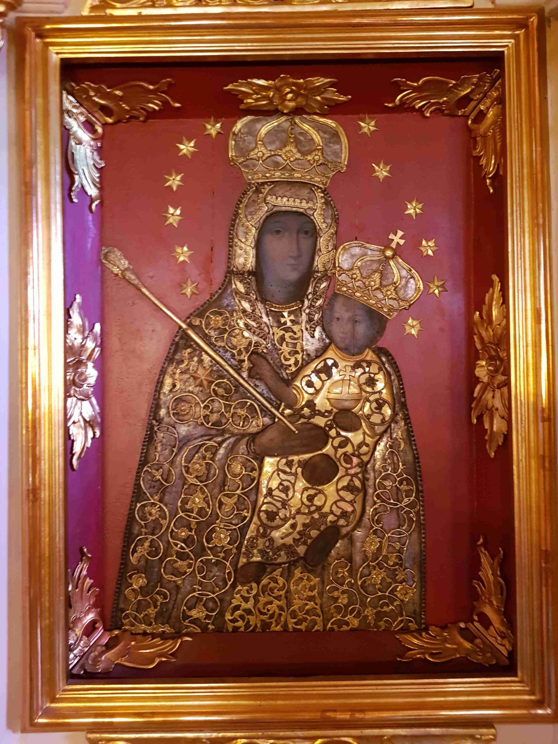 Obraz cudownie ocalał z kościoła spalonego przez Kozaków Chmielnickiego w 1648 roku i przeniesiony do nowo wzniesionego kościoła w latach 1667-1670. W inwentarzu z 15 listopada 1714 roku znajdujemy zapis, iż „Matka Boża Różańcowa miała swoją kaplicę i dwuczęściowy ołtarz, w którym znajdowały się figury św. Jana Chrzciciela i św. Józefa.”