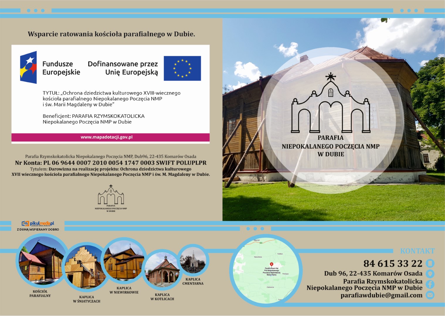 Parafia pw. Niepokalanego Poczęcia NMP i św. Marii Magdaleny w Dubie uzyskała dotację z Unii Europejskiej na projekt „Ochrona dziedzictwa kulturowego XVIII-wiecznego kościoła parafialnego Niepokalanego Poczęcia NMP i św. M. Magdaleny w Dubie”.